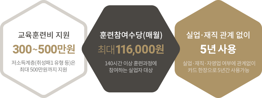* 실업자,저소득 재직자(근로장려금 수급자)는 140시간 이상 훈련 참여 시 월 최대 116,000원의 훈련장려금 지급국민내일배움카드 지원내용 지원대상 훈련비 지원율 국민내일배움카드 소지자 최대 300만원 한도로 훈련비 45~85% 지원 취업성공패키지 1유형 최대 500만원 한도로 훈련비 50~85% 지원 취업성공패키지 2유형 최대 300만원 한도로 훈련비 80~100% 지원